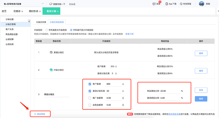 2、给每个等级设置等级权益,包括商品佣金比例和邀请奖励比例。