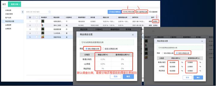 3、可设置默认佣金比例(按分销员等级),新添加的商品则按此默认佣金比例;也可批量设置佣金比例。