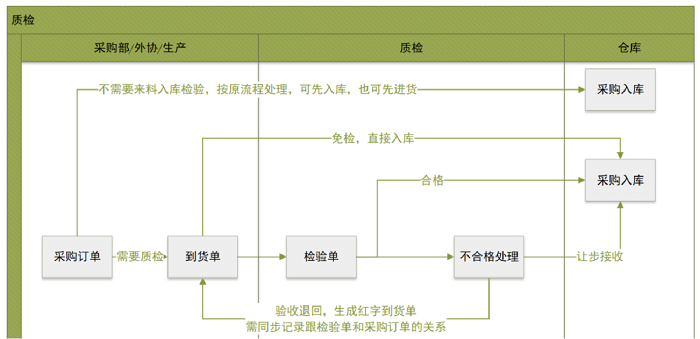存货需要质检:由到货单流转到检验单,质检后,再由检验单生成入库单。