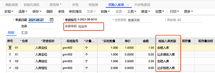 合格入库:生成入库单,将合格数量带入到入库单的数量中,检验入库类型为合格入库