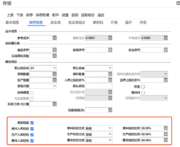 启用质检管理后,存货档案中增加质检设置:需要质检、来料入库检验、生产入库检验、委外入库检验、检验方式、检验比例。