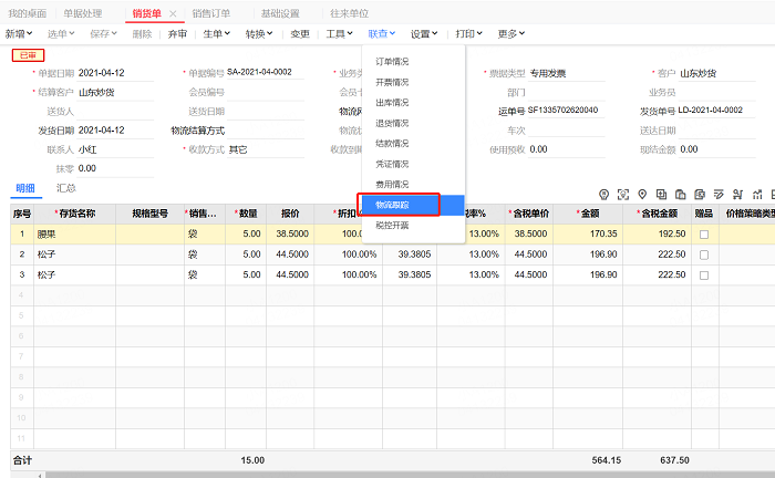 业务员可以随时在销货单上通过联查,查询到到物流状态,查看客户的货物运送情况;