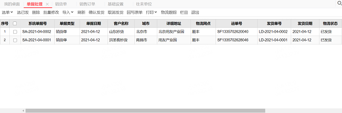Step1:物流管理选择好销货单确认发货后可以通过打印电子面单自动生成运单号,同时运单号也能自动回填到销货单上;