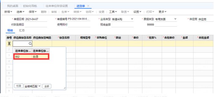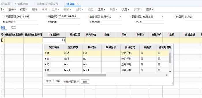 我们在单据中通过存货名称过滤可以看到带出来很多存货