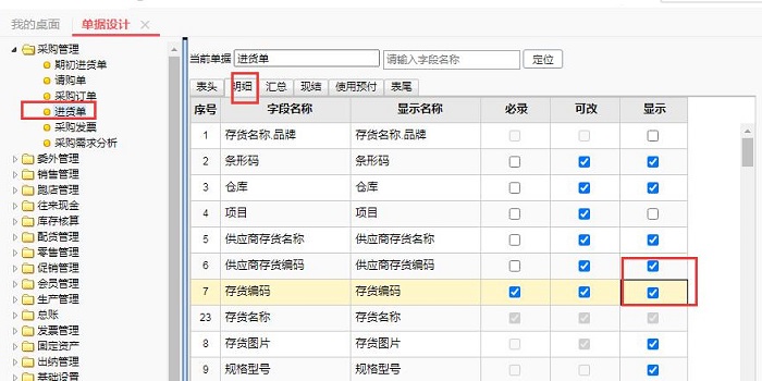 第二步:单据设计中把供应商存货名称和供应商存货编码显示出来。