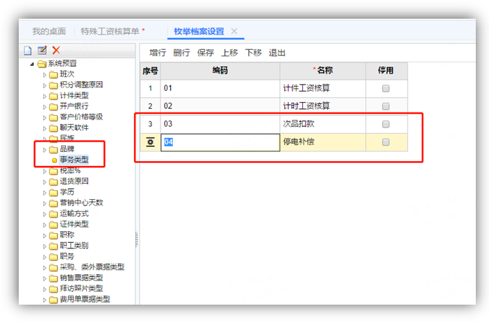 1、新增【系统管理】-【事务类型】枚举档案:例如:次品扣款,停电补偿。