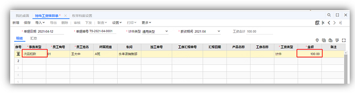 2、在【计件工资】模块新增【特殊工资核算单】,选择对应工人的名字,输入对应的金额。