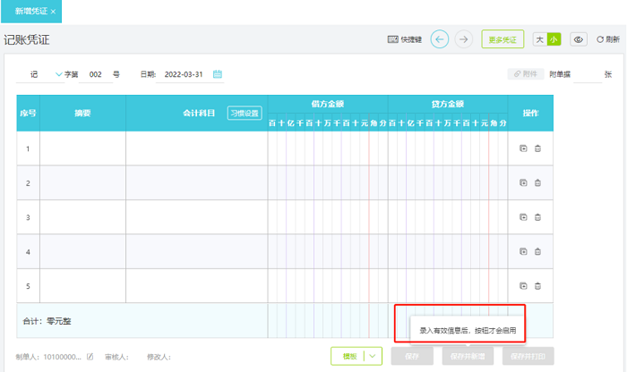 【总账】-【新增凭证】未录数据前保存、保存并新增、保存并打印按钮是置灰状态,为了让客户更容易理解,在置灰状态下增加了提示。