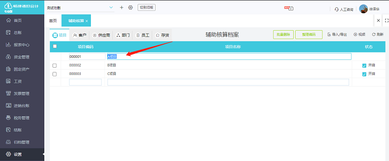 第一步:进入【设置】-【辅助核算】-【项目】,添加各项目名称;