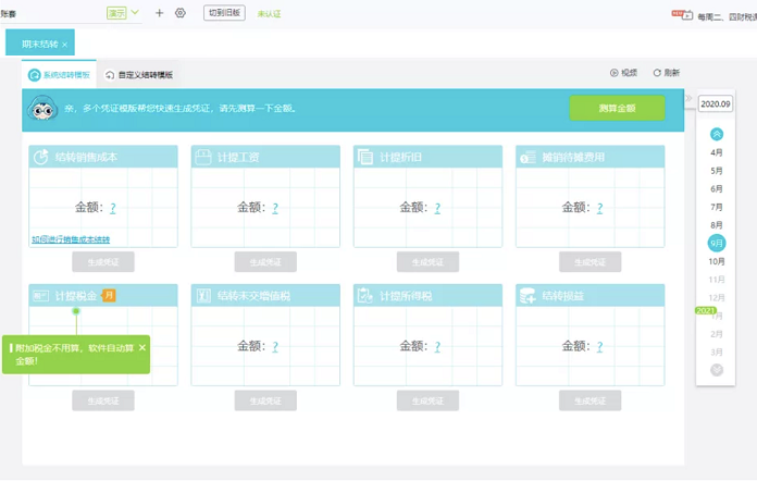 在这个好会计秘籍中,只要点击【测算金额】,自动计算本期月末结转金额,生成或查看凭证可确定业务是否完成,一个界面搞定每月月末结转,快速没有遗漏;