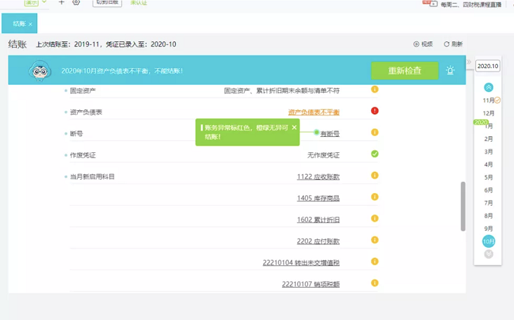 当结账内容出现异常,点异常提示快速调整,如:资产负债表不平衡,直接点不平衡项进入资产负债表,可查看造成不平衡的具体项,并快速修改。