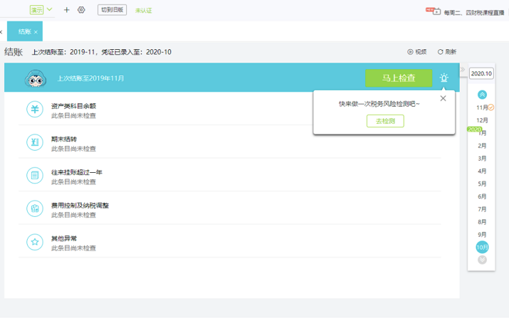 通过好会计【马上检查】,一键查看系统设定的5大类检查项:资产类、期末结转、往来款项挂账情况、费用控制纳税调整、其他异常。