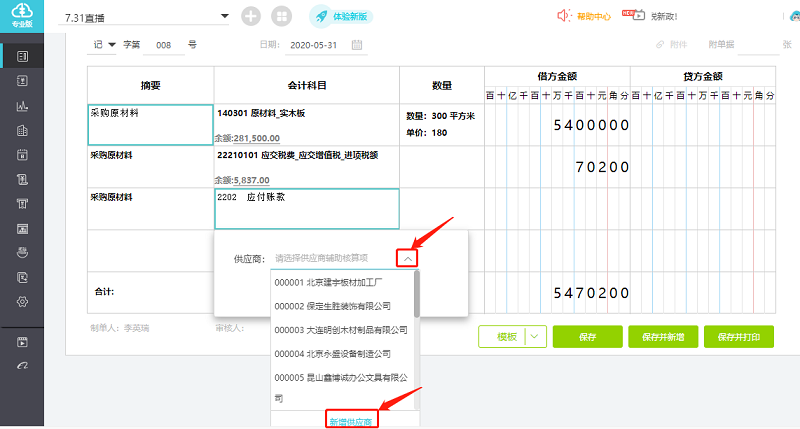1、打开【凭证】-【新增凭证】界面,正常做凭证,比如,采购原材料的业务,当输入应付账款时,会自动弹出选择供应商辅助核算的下拉框(前提是已经对“应付账款”科目勾选了“供应商”辅助核算);