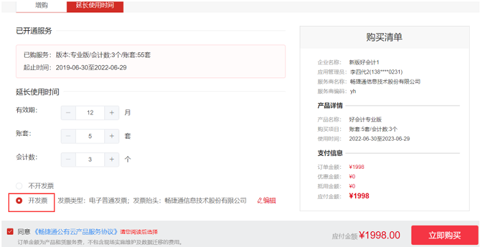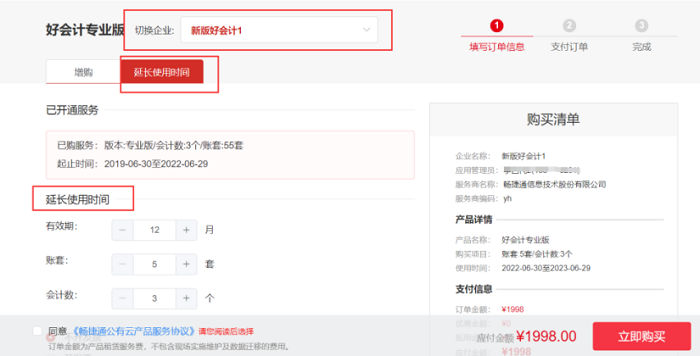 2.跳转至购买好会计xx版界面,确认左上角的购买企业是否正确,选择【延长使用时间】,根据自身需求选择购买的有效期、账套等信息,勾选左下角的【同意】,如不需要增购站点账套的,按照默认带出的站点及账套数进行购买即可: