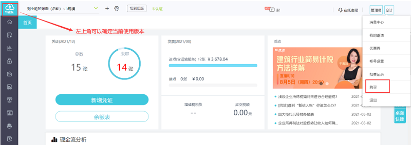 1.进入好会计产品,产品左上角可以查看当前使用产品版本,鼠标放在右上角名字处,可以点击【购买】按钮: