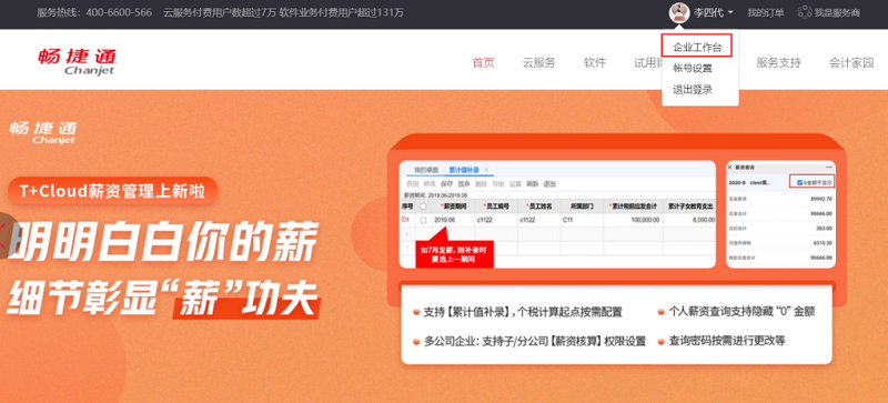 1.用管理员账号密码登录畅捷通官网,鼠标放在右上角头像,点击【企业工作台】进入: