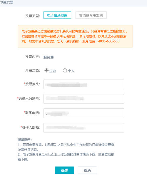 3.根据提示,选择发票类型,可以选择普票或专票,填写相关内容,确定保存即可: