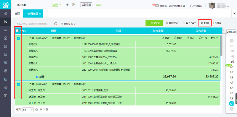 1.登录好会计后,点击左侧菜单栏【总账】-【查看凭证】,勾选需要打印的凭证(或点击【全选】打印所有凭证),点击凭证右上方【打印】按钮。