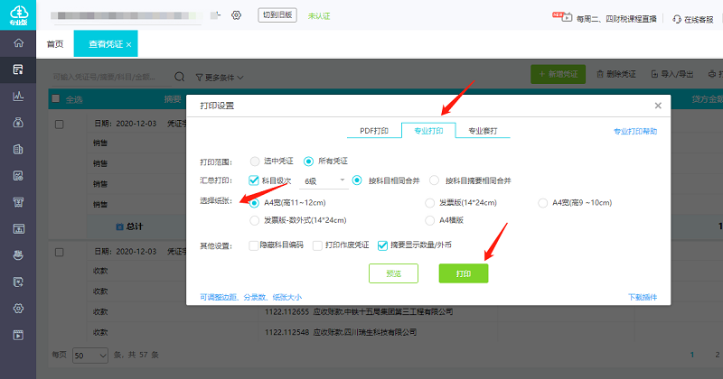 公司在打印凭证时,如果采用的是空白凭证纸,则可以选择专业打印。专业打印更为灵活,可以自定义设置纸张大小、每页凭证数量、分录条数等。