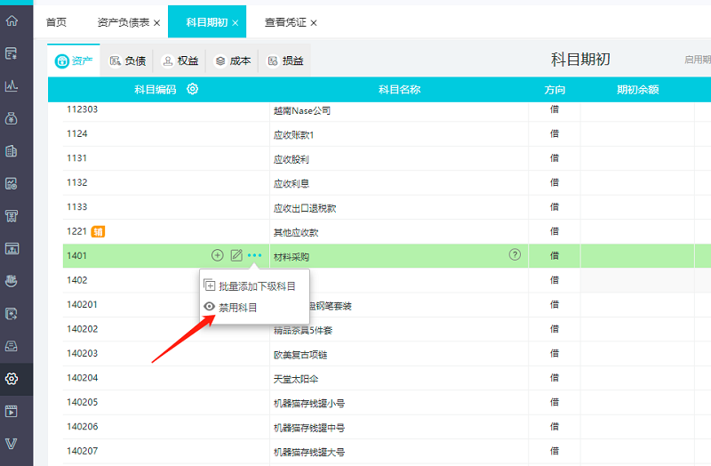 这里给大家解释一下,禁用科目顾名思义就是将这个科目禁止使用了,我们在科目期初里还是能看到这个科目,但是在做账的时候是无法找到这个科目的。