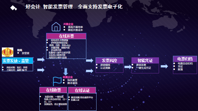 用友畅捷通是一家专门致力于服务小微企业的软件服务提供商,旗下的好会计产品就能够很好的满足要求,从电子发票的在线开具、在线收票、在线认证、到智能生产凭证、自动关联凭证号索引查询、到最后电票归档等,实现电子发票“全程无纸化”管理。