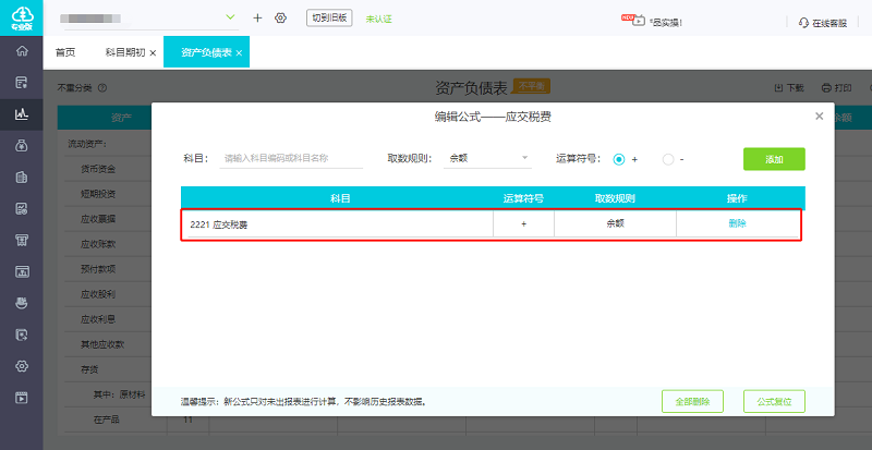 1.进入【报表中心】-【资产负债表】,点击【应交税费】-【FX】,删除所有明细科目的余额取值,只留一级科目【2221应交税费】的取值;