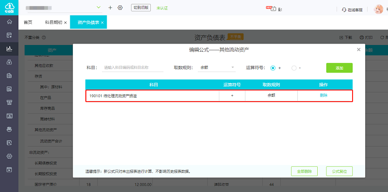 注:若想改回软件默认的取值方式,可分别点击“应交税费”和“其他流动资产”编辑公式框内的公式复位。