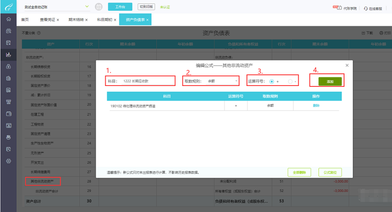 (3)选择好科目“1222长期应收款”,取数规则可参照其他同类科目选择“余额”,运算符号“+号”为增加金额,“-号”为减少金额,选择“+号”。