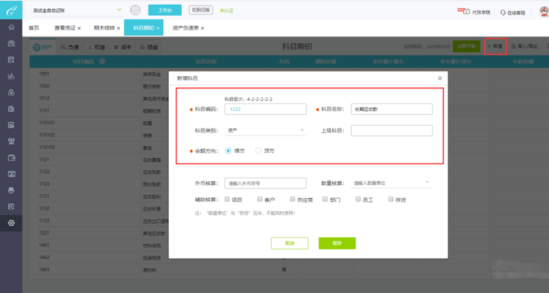 日常账务处理中,因为每个企业具体业务不同,用到的会计科目也会有差别,如“其他应收款”能满足大部分企业的做账需求,但有些公司回收款项的时间又很长,则需要用到“长期应收款”科目,好会计软件支持用户根据自身情况去创建一级科目,需要注意的是科目添加后,还要加入资产负债表取值,防止报表不平衡。