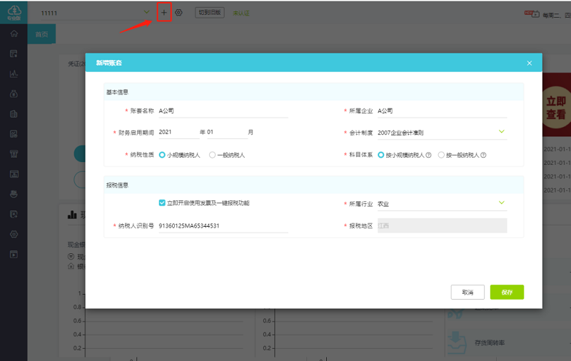 (3)【账务启用期间】-软件中做账的起始期间;例如:2002年10月购买软件,但是想从年初开始做账,那么财务启用期间可选择2020年1月。
