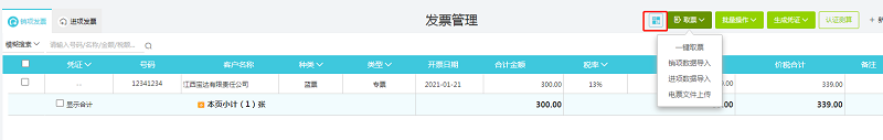 2、通过“发票管理”-“发票”-“进项发票”菜单,点击取票旁的二维码将进项发票扫描进进项发票中。(操作步骤同上)