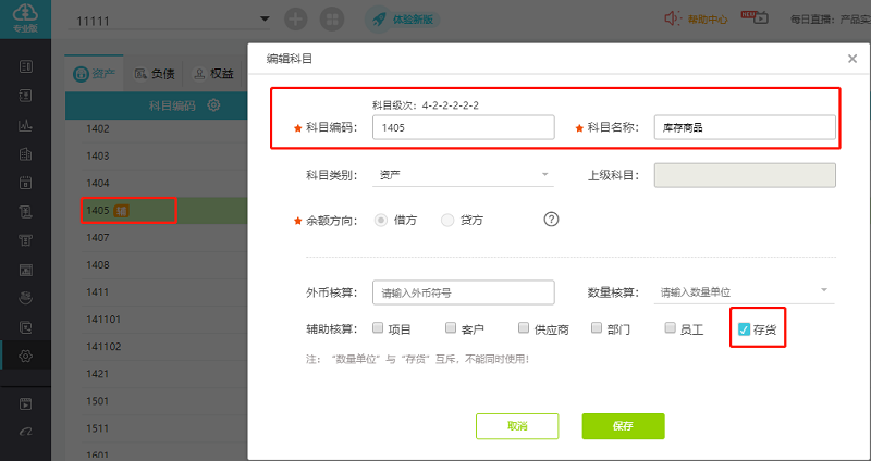 1、首先在【设置】-【科目期初】 选择“库存商品”、“主营业务收入”、“主营业务成本”三个科目,分别勾选【存货】辅助核算。