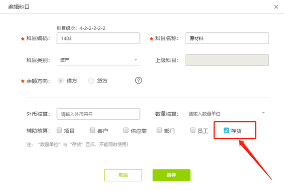 1、在【科目期初】里把“原材料”和“库存商品”科目勾选上【存货】辅助核算;