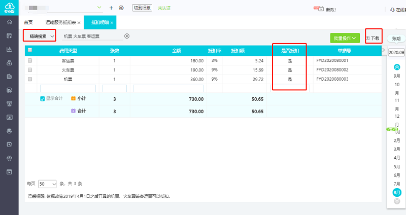 ②查看审核相关明细数据,自动实现票据编号,支持取消抵扣设置,支持简单查找与精确搜索两种查询模式。同时,还支持将归集的进项票据台账导出Excel表格。依次点击【税务管理】-【运输服务抵扣统计表】-【抵扣明细】。
