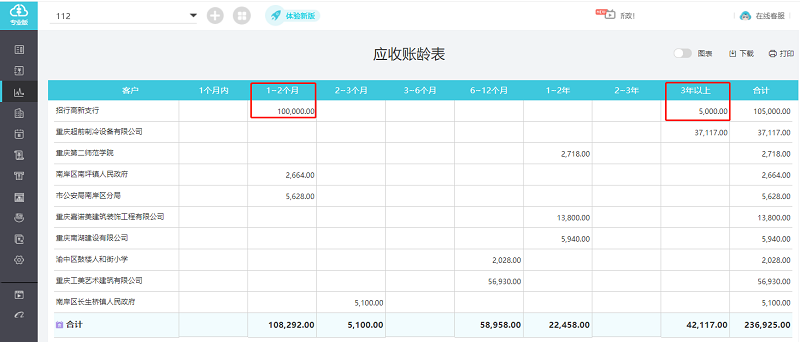 畅捷通好会计,内置【应收账龄表】,按照每个账龄区间自动统计应收账款余额,方便直接查看数据。也可以直接将报表导出发给业务人员,方便催收。