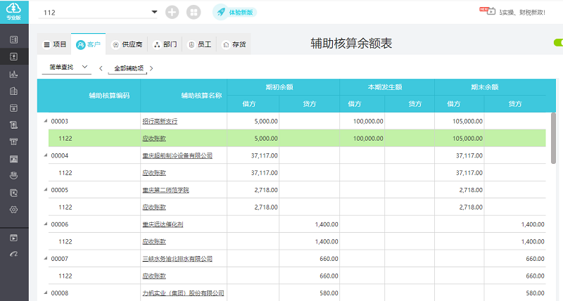 还可以通过【辅助核算余额表】与【辅助核算明细账】直接查看每家客户的详细情况。
