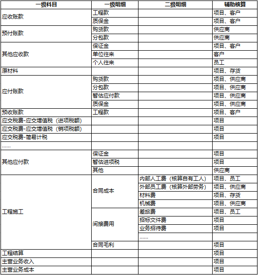 下图就是为大家整理的建筑行业经常使用的明细科目及辅助核算,因每家账务核算及具体情况并不一致,所以下列清单仅供参考: