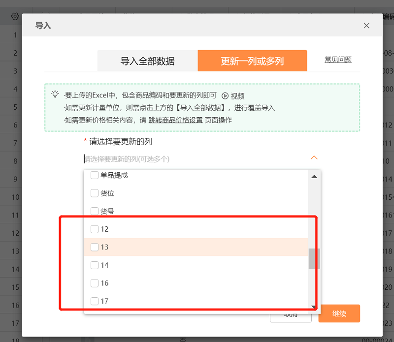 产品解决方案:在【基础信息】—【商品】,导入商品,选择【更新一列或多列】,可以勾选档案自定义设置的自定义项进行导入。