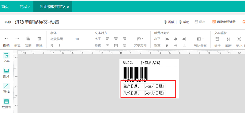 支持保质期标签打印模板自定义设置,标签打印模板中可显示生产日期与失效日期。