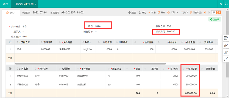 解决方案:采购配件回来,工人直接组装,通过组装单自动将材料成本、制造费用归集分摊到成品上。