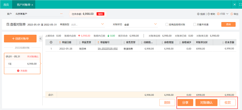 解决方案:通过电脑端,手机端随时跟客户对账,将对账单分享给客户,并且对账之后可以一键收款。