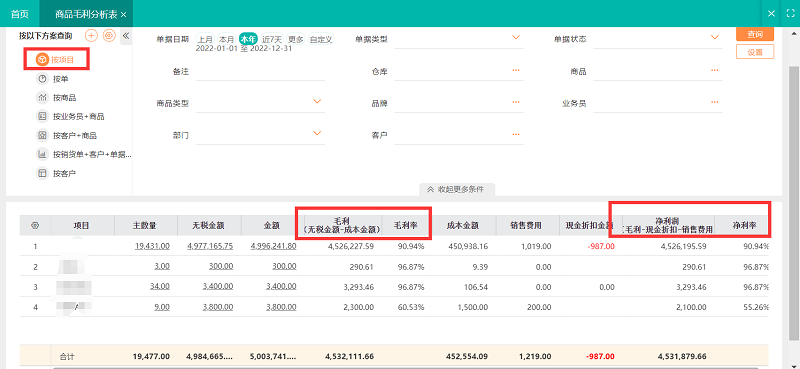 解决方案:销售毛利分析表随时按项目查看利润情况,成本、费用是否异常,帮忙老板做决策,是否要控制成本费用。