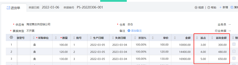 在单据上按企业需要规划采购和销售返利逻辑,实现单据每种商品返利实时计算
