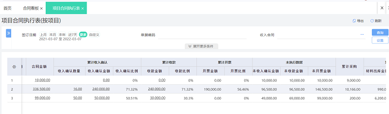 解决方案:项目/合同看板实时查看项目收入、支出和利润;【项目合同执行表】实时查询合同金额、收入金额、开票情况、采购、出库以及费用各项数据。