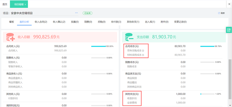 解决方案:项目看板、合同看板盈利分析直接实时归集相关项目的材料成本、分包成本、费用,及时掌控成本是否有异常。