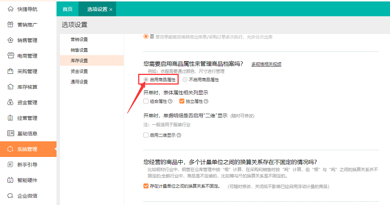 系统管理-选项设置-库存设置,启用商品属性设置,在基础信息中可以维护多种商品属性。