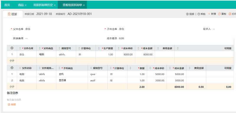 好生意中可以使用【组装拆卸单】做产品的组装、拆卸业务,统计组装成品,自动计算产品、配件耗用、成本情况……