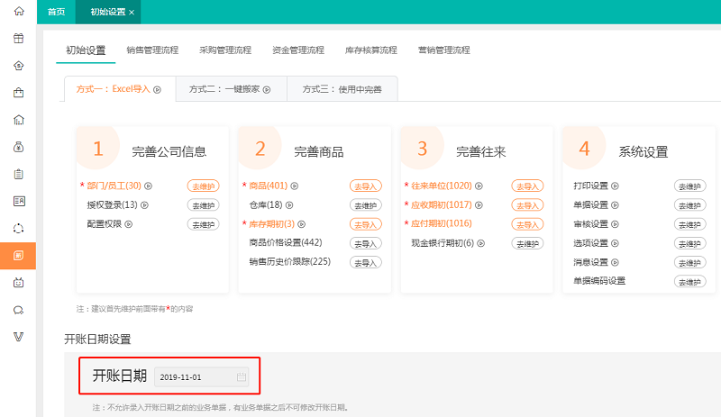 点击【新手引导】-【初始设置】中可以查建账日期是否为灰色,灰色时则说明账套中存在业务单据,无法进行修改。