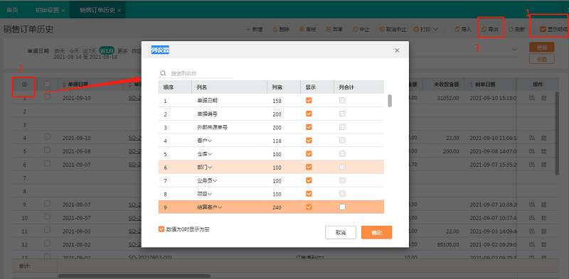 业务单据可以到单据历史中,勾上右上角的【显示明细】,并且点击设置,把单据关键的字段信息勾上显示后进行导出。
