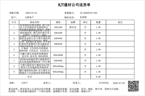 业务人员正常开单,比如在门店用电脑开单,在客户那边手机开单。开完单后选择仓库的打印机及送货单模板打印,能解决仓库看不清字,没型号,送货地址等问题,同时仓库还不用重新手写送货单据。